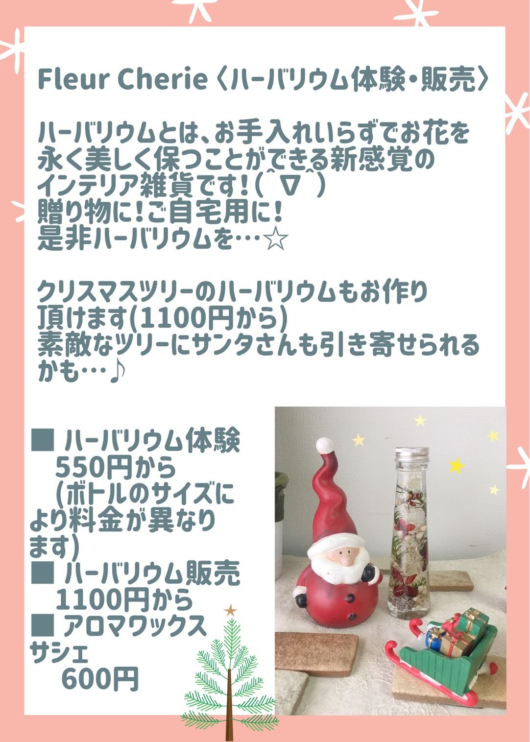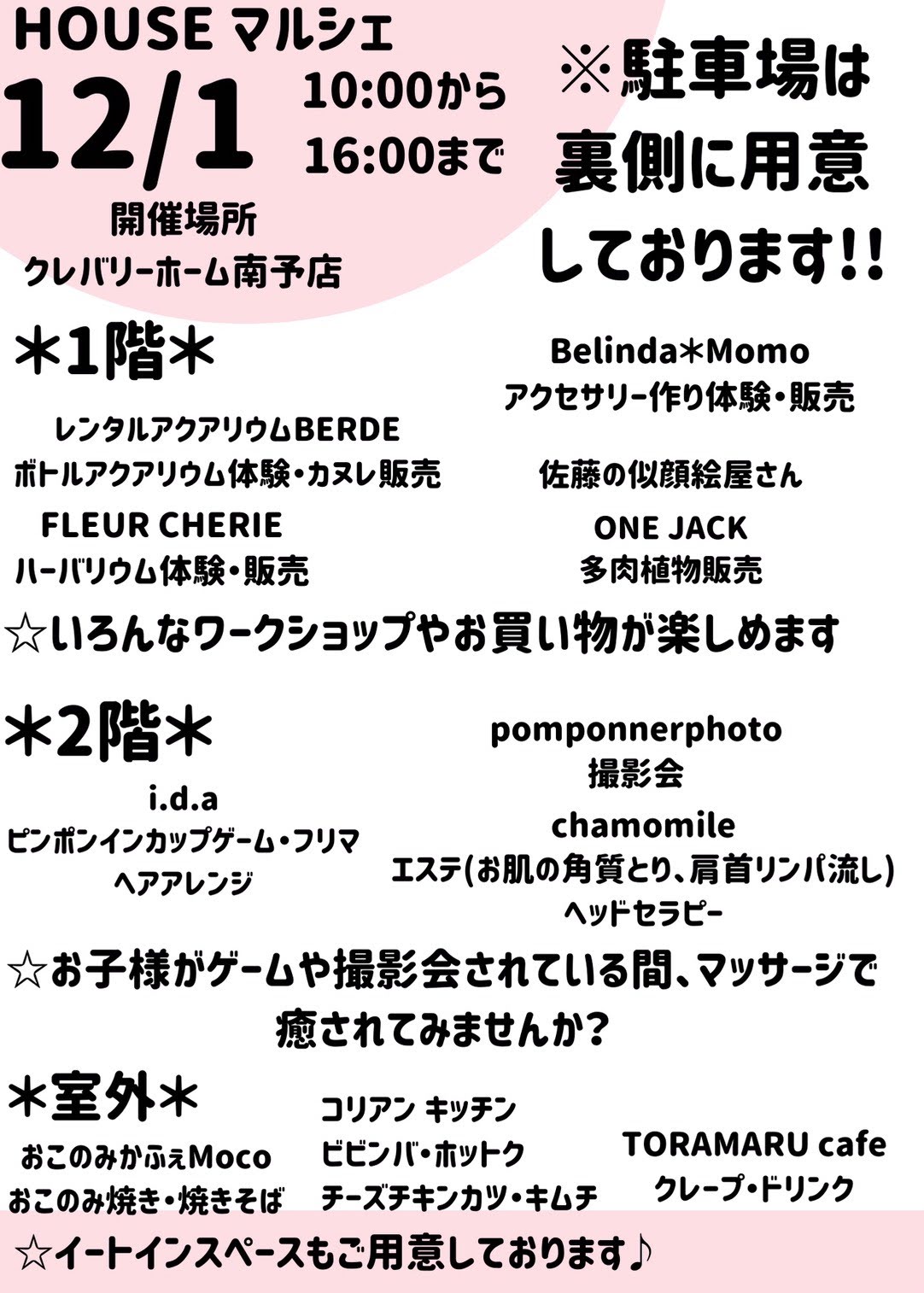 NEWS お知らせ 2019.11.29 「HOUSE マルシェ」 12月1日「HOUSE マルシェ」 主催者さま ◎Belinda*Momo 出展者さま ◎FLEUR CHERIE ◎pomponnerphoto(ポンポネフォト) ◎i.d.a ◎レンタルアクアリウムBERDE ◎佐藤の似顔絵屋さん ◎chamomile ◎ONE.JACK ◎おこのみかふぇMoco ◎TORAMARU cafe ◎コリアンキッチン 前の記事 > < 次の記事 ニュース一覧へ戻る