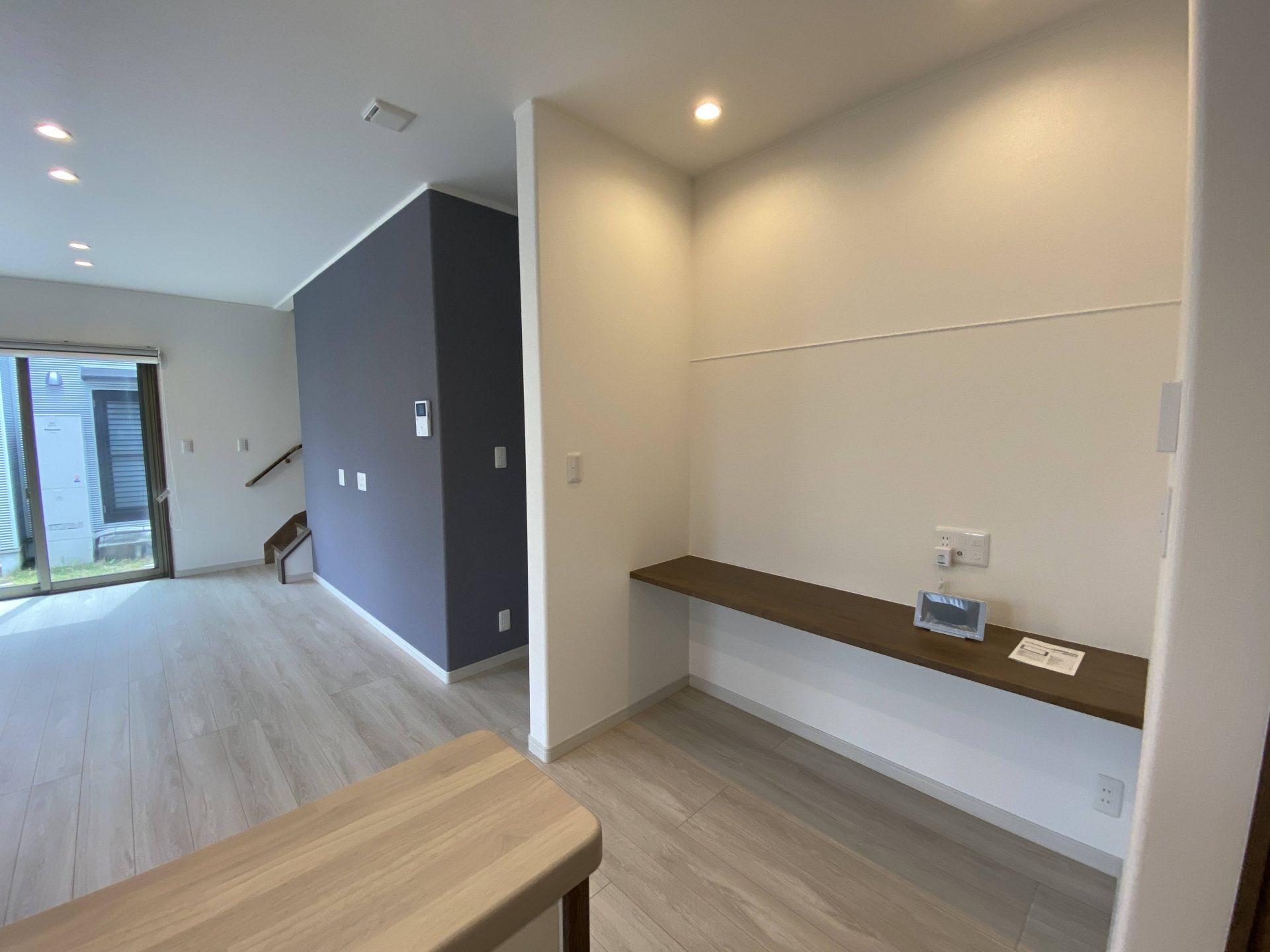 クレバリーホームの床材ミスティグレーの床にアクセントクロスはネイビー